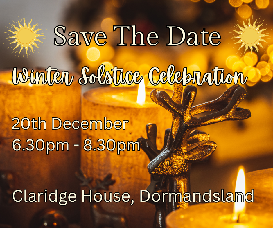 Come and join us on the Eve of Winter Solstice as we welcome back the returning of the light. We will spend some time considering our relationship to the darkness – setting intentions as to what we want to take with us into the Winter, we will honor the Sun and returning of the light through candle ceremony and craft and we will end with a beautiful EcoNidra guided mediation that will deepen our connection with nature and resource us for the Winter ahead. As this celebration has it’s roots in nature, we will try to spend some time outside around the fire pit as part of the celebration, but if the weather is not on our side we will enjoy the cosy tranquility of Claridge House.